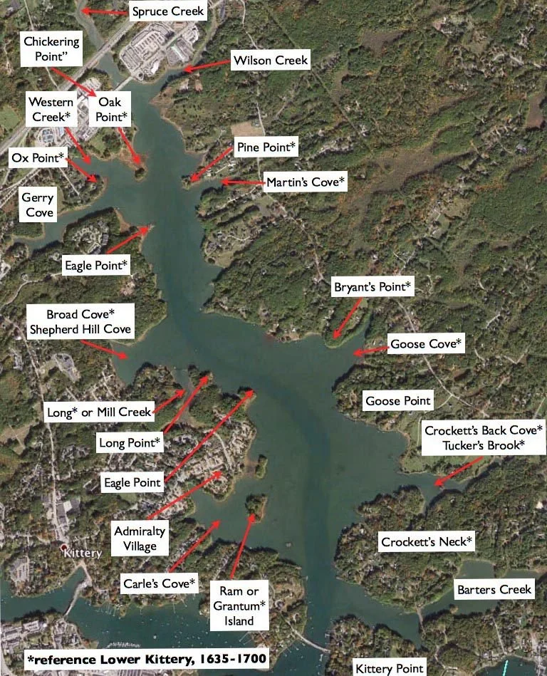Sources: Video stills from aerial footage by Jim White of Spruce Creek TV. Map from Lower Kittery, 1635-1700 and Google Maps with markers for approximately 10 offshoot creeks and coves. All clips are from the 2021 bloom.