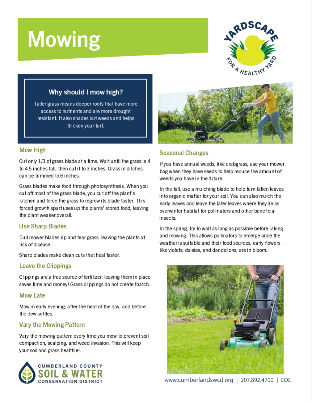 Taller grass has deeper roots which help prevent stormwater runoff. It also creates a more fertile environment for natural wildflowers that support pollinators. Grass clippings also provide your lawn with all the nitrogen it needs. Click the oval to see the handout.